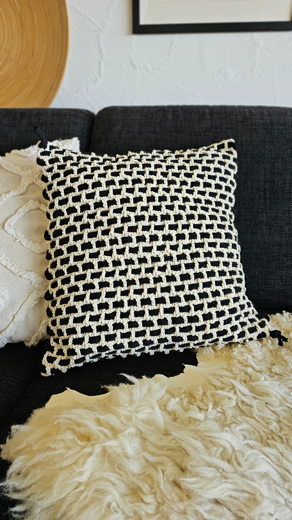 Today I’ll guide you through the process of making a chic black and white crochet cushion cover – super easy and beginner-friendly! We’ll create a simple mesh pattern using just double crochet and chain stitches. Once the base is finished, we’ll weave a thicker black yarn through the mesh to add a modern, graphic look. Perfect as a cozy accent for your living room, bedroom, or as a handmade gift!
